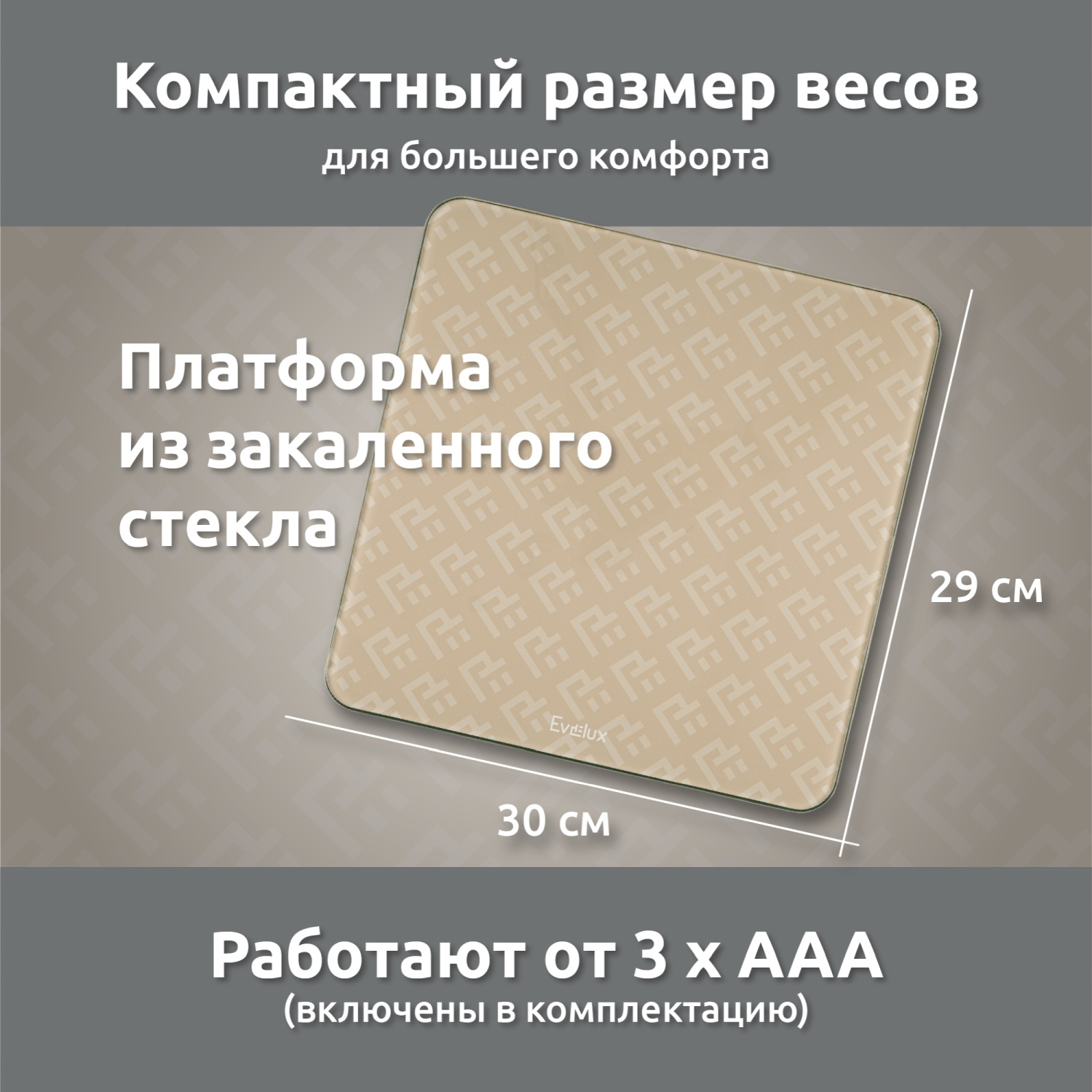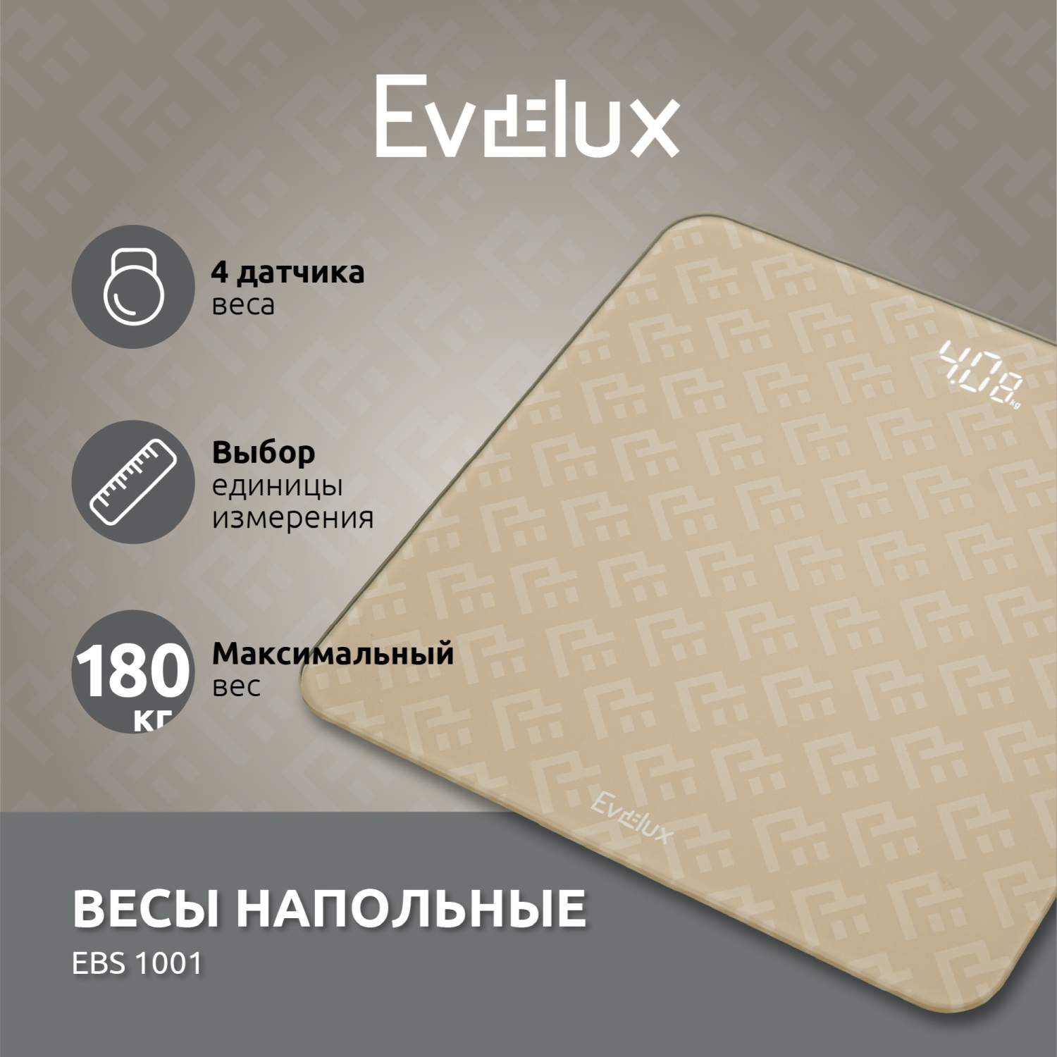 Напольные весы EBS 1001 – это стильный и функциональный бытовой прибор, который станет незаменимым помощником для отслеживания и контроля веса, а также поддержания здорового образа жизни. Выполненные в ненавязчивом бежевом цвете, они прекрасно впишутся в любой интерьер. Весы оснащены ярким LCD-дисплеем, который обеспечивает четкое отображение данных. Платформа весов изготовлена из закалённого стекла толщиной 5 мм, что гарантирует прочность и долговечность. Весы предлагают выбор единиц измерения: граммы или фунты. Предельный вес, который может измерять прибор, составляет 180 кг с шагом в 50 г – для точного контролироля массы. Автоматическое включение и выключение обеспечивают удобство эксплуатации, а индикация низкого заряда батарей позволяет не беспокоиться о неожиданной разрядке. Весы работают от 3 батареек типа 1,5 V AAA, которые уже включены в комплектацию. Габариты прибора составляют 300x292x30 мм, а масса – 1,5 кг. На весы предоставляется гарантия сроком на 12 месяцев.
