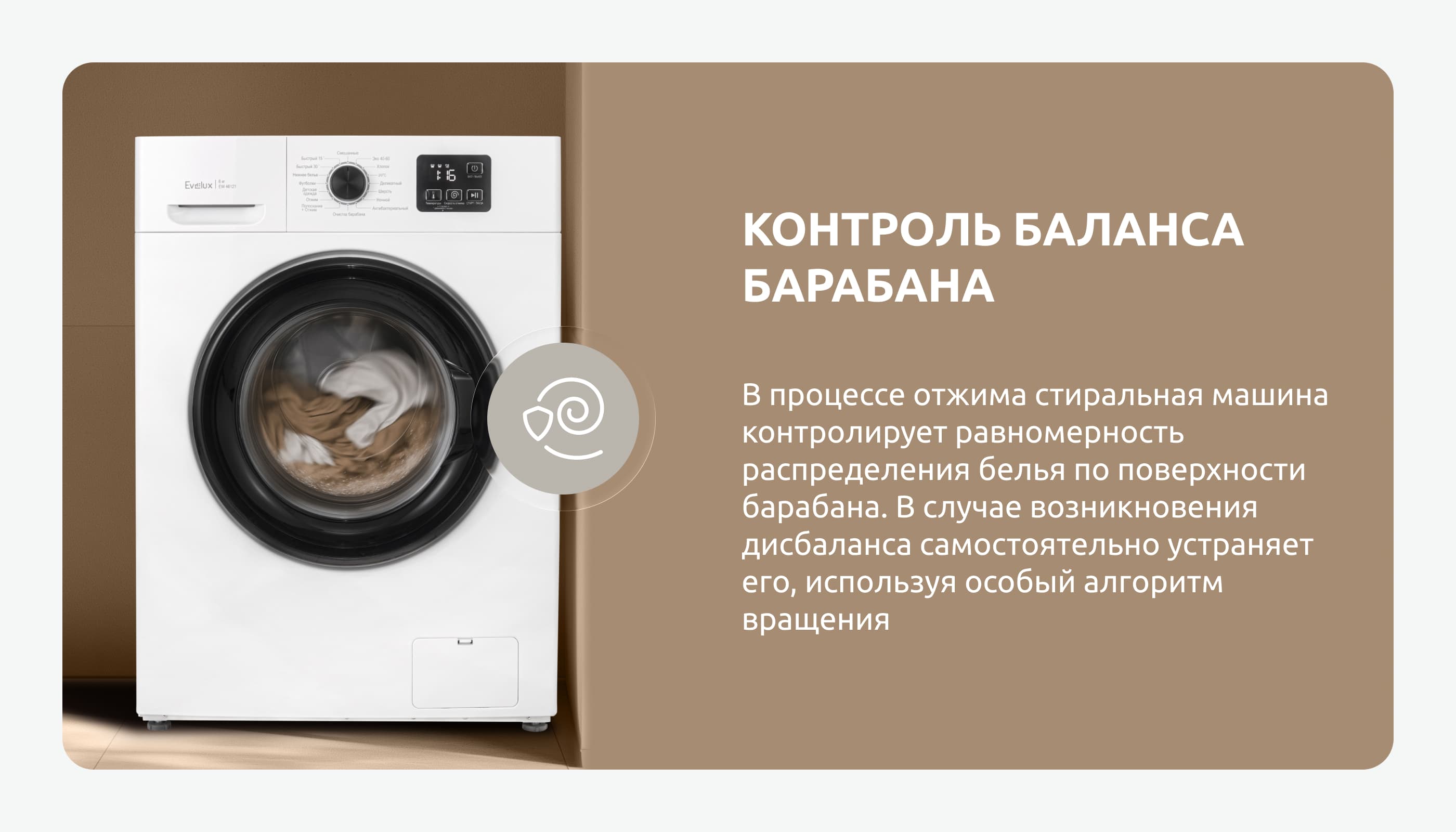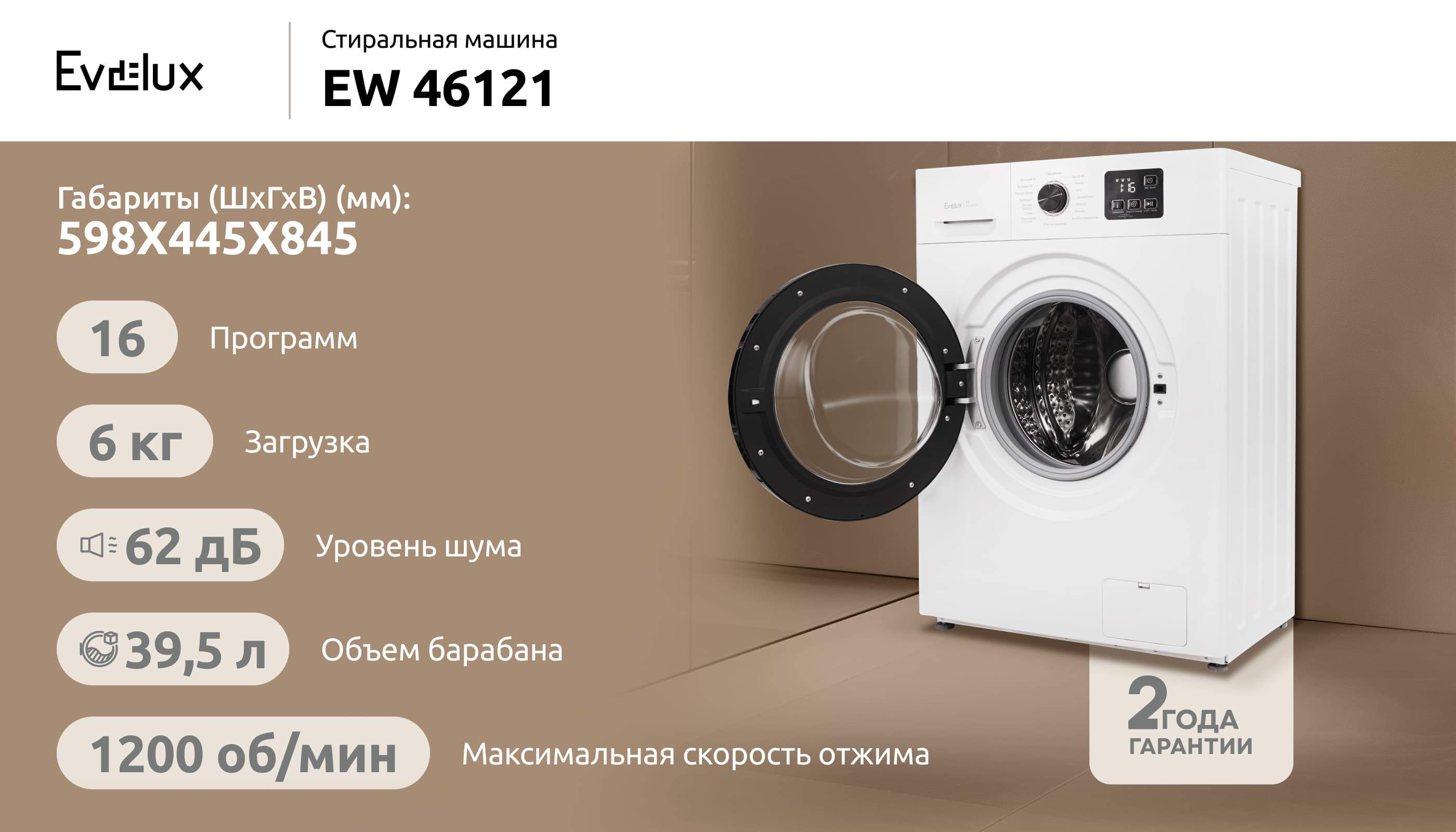 Стиральная машина EW 46121 – стильный и функциональный прибор, выполненный в классическом белом цвете. Она имеет фронтальный тип загрузки и глубину 44,5 см. Объем барабана составляет 39,5 литра, что позволяет загружать до 6 кг белья. Максимальная скорость отжима достигает 1200 об/мин. Стиральная машина предлагает 16 программ стирки, включая специальные режимы для различных типов тканей, детской одежды, нижнего белья и быструю стирку на 15 и 30 минут. Машина оснащена функцией отложенного старта до 24 часов. Важными особенностями модели являются контроль баланса барабана и контроль пенообразования. Стиральная машина EW 46121 имеет класс энергопотребления A++ и является отличным выбором для тех, кто ценит производительность, экономичность и экологичность.