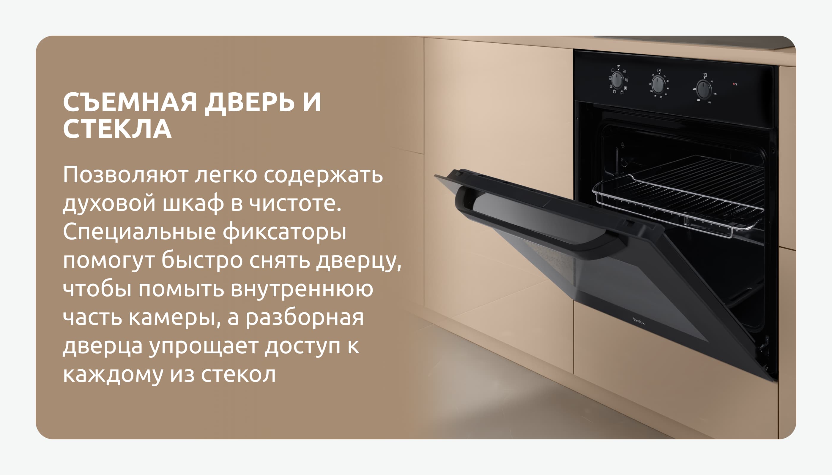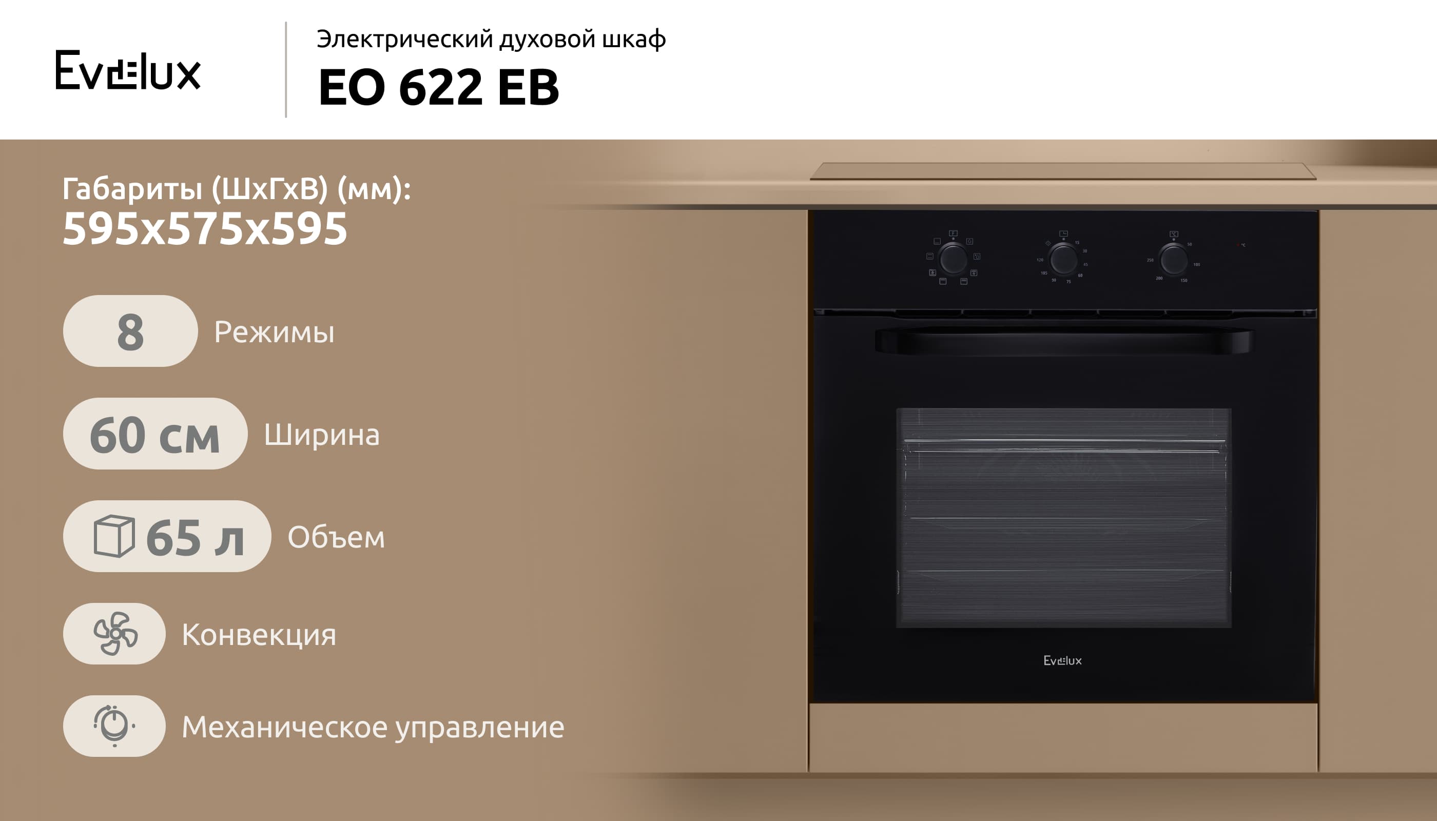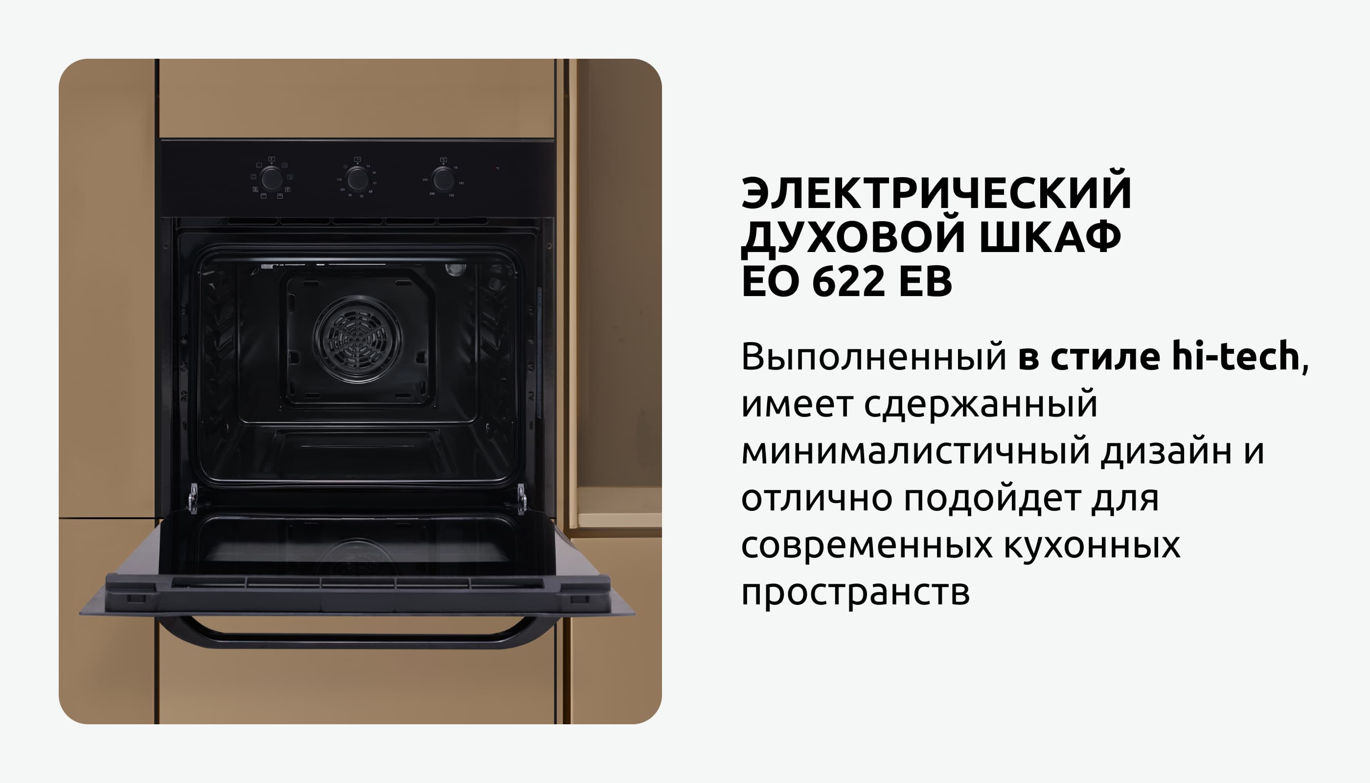 Электрический духовой шкаф EO 622 EB шириной 60 см и объемом 65 литров, выполненный в стиле hi-tech, имеет сдержанный минималистичный дизайн. Утапливаемые поворотные переключатели, фронтальная поверхность из стекла и металлическая ручка дверцы придают ему современный вид. Духовой шкаф оборудован восемью режимами работы, что позволяет осуществлять разнообразные способы приготовления блюд, а также обеспечивает равномерное прогревание и высокий уровень эффективности. Встроенный таймер позволяет устанавливать время работы духового шкафа, по истечении которого прибор самостоятельно отключится. В комплекте идут решетка-гриль и универсальный противень. Освещение внутренней камеры обеспечивается лампой в 25 Вт, класс энергопотребления прибора А свидетельствует о его высокой энергоэффективности.