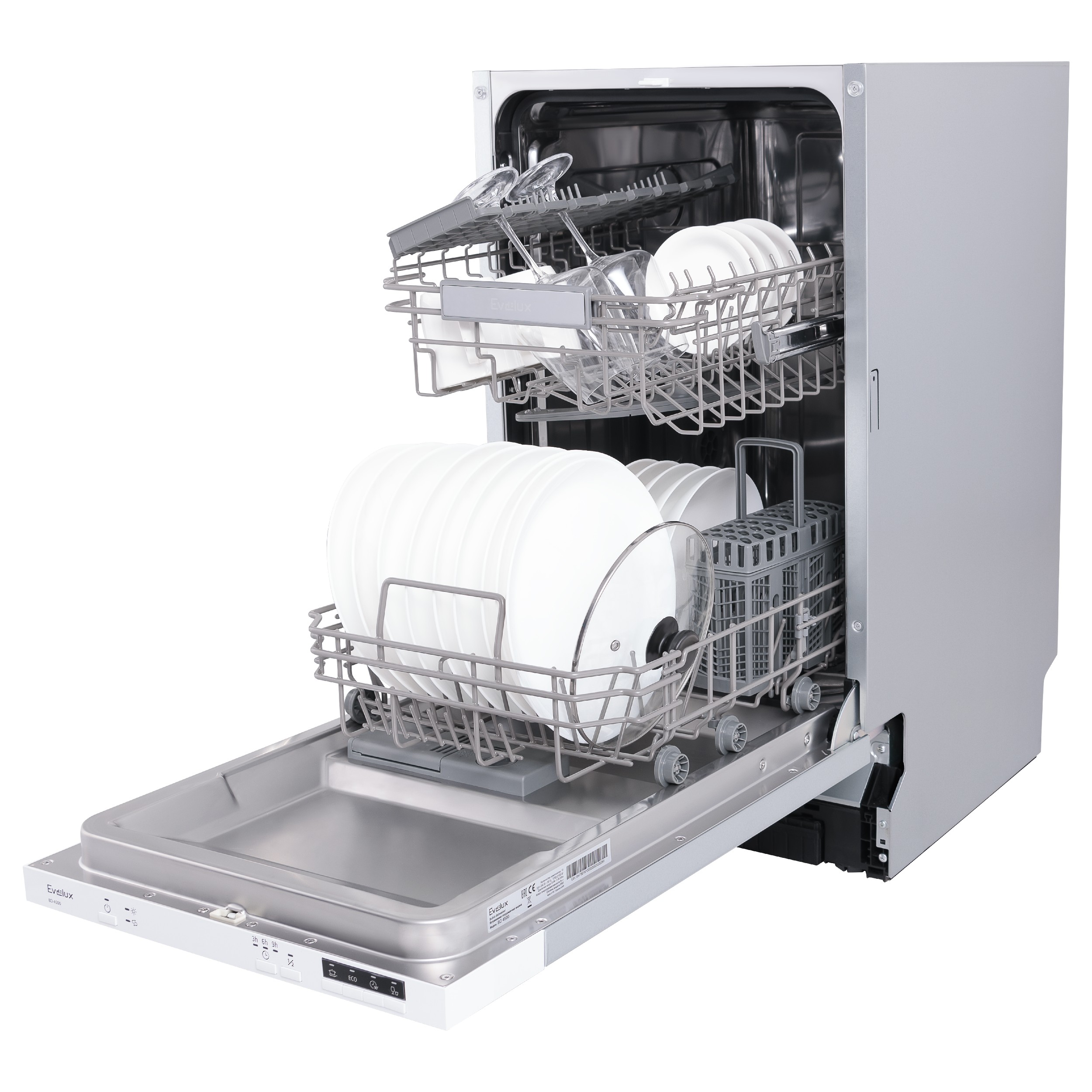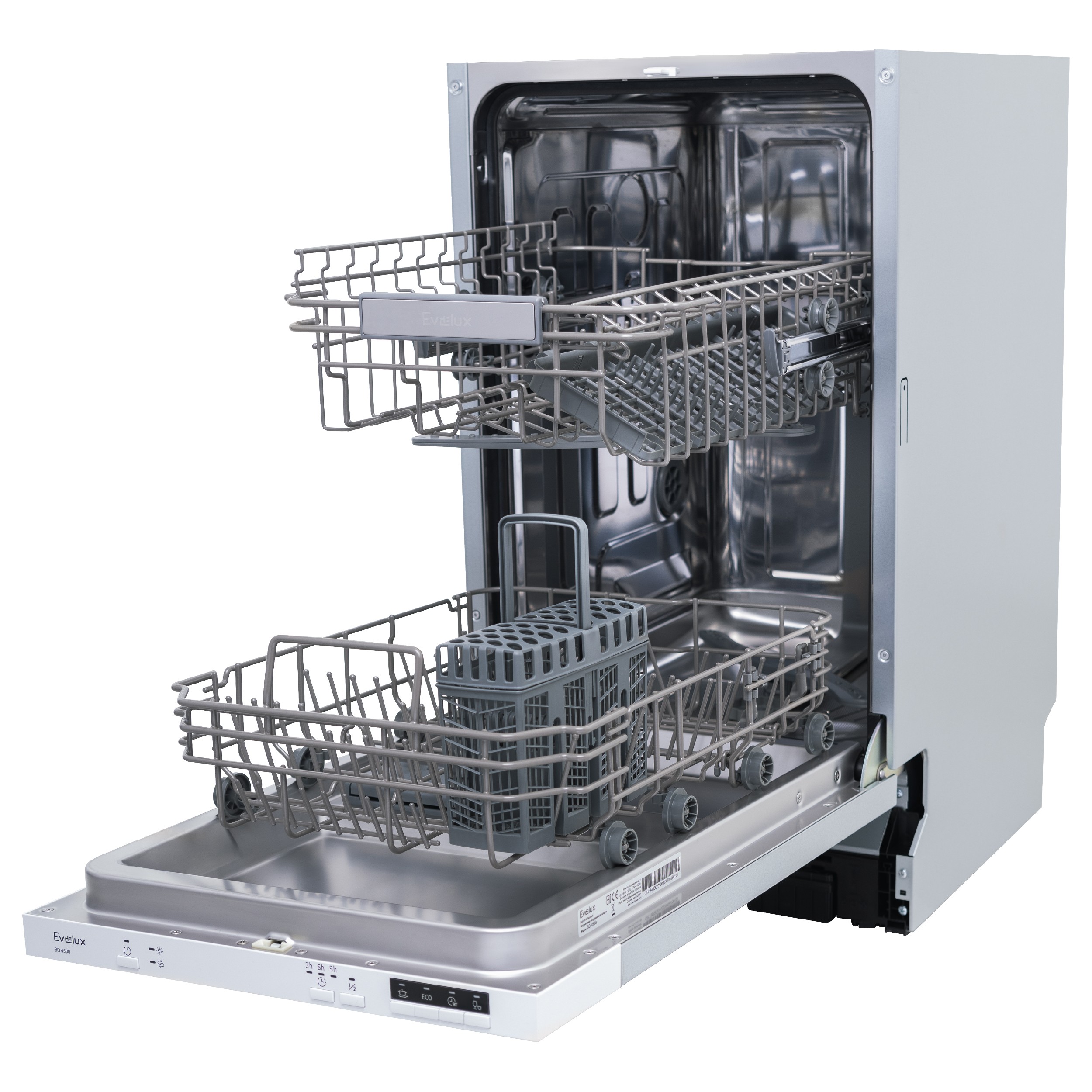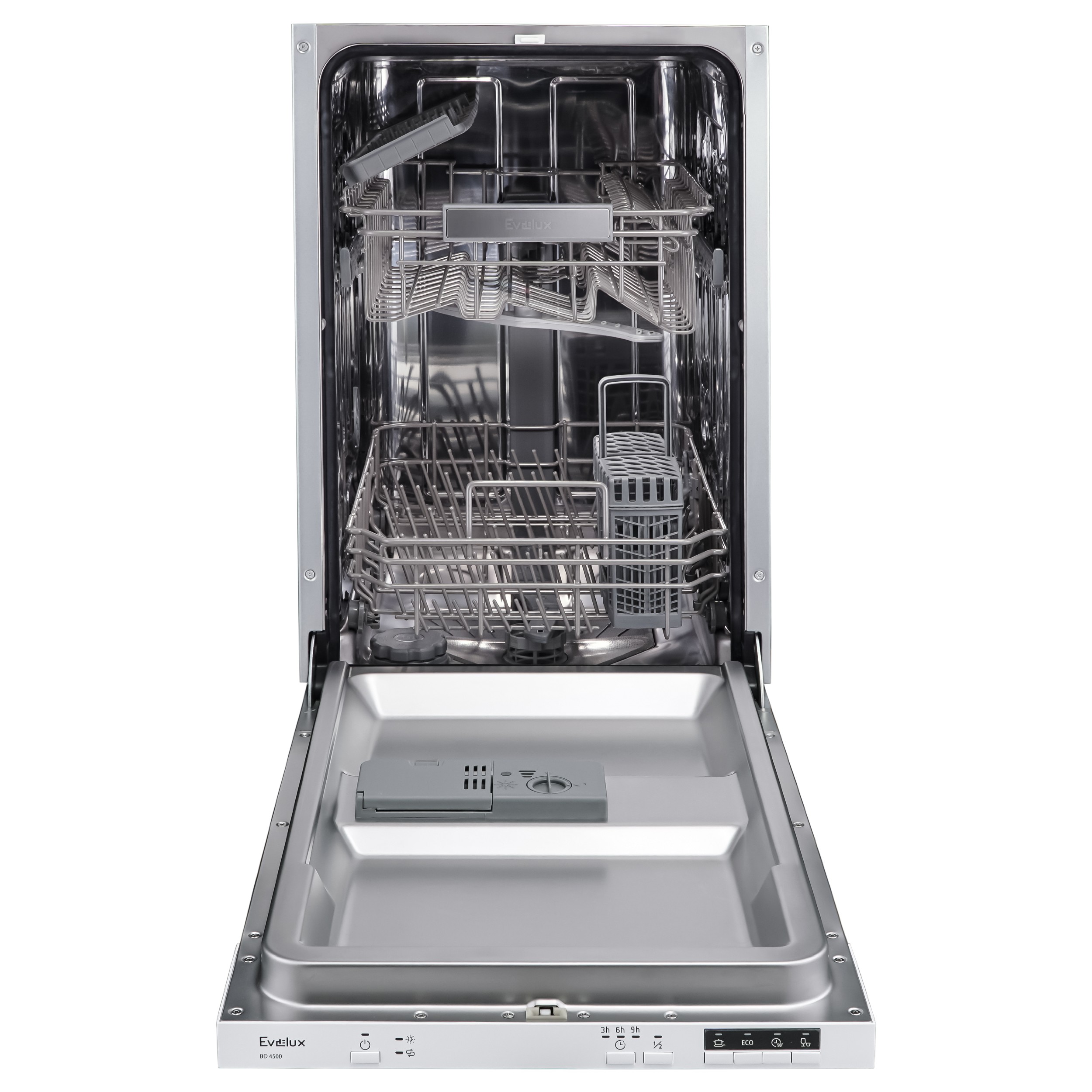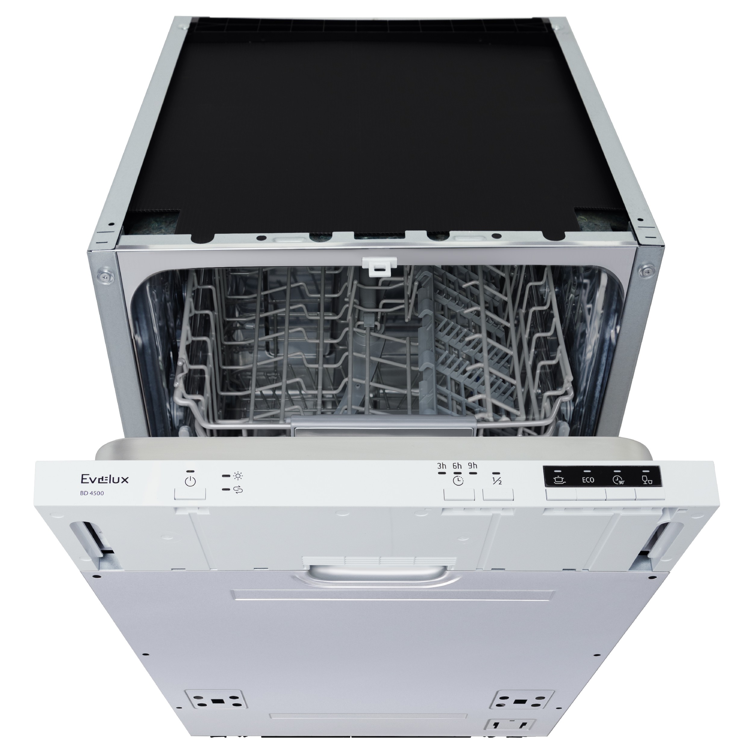 Компактная встраиваемая посудомоечная машина шириной всего 45 см подходит для небольших кухонных пространств, при этом практически не уступает в объемах загрузки стандартным моделям. Эта удобная и экономичная техника предлагает четыре режима работы: интенсивная мойка, быстрая мойка, энергосберегающий режим «Эко» и универсальный режим, рассчитанный на 90 минут. Модель поддерживает половинную загрузку и функцию отложенного старта. Подсвечиваемые кнопки обеспечивают дополнительное удобство при выборе режимов мойки. Посудомоечная машина Evelux BD 4500 имеет класс энергопотребления A++ и отличается низким уровнем шума.