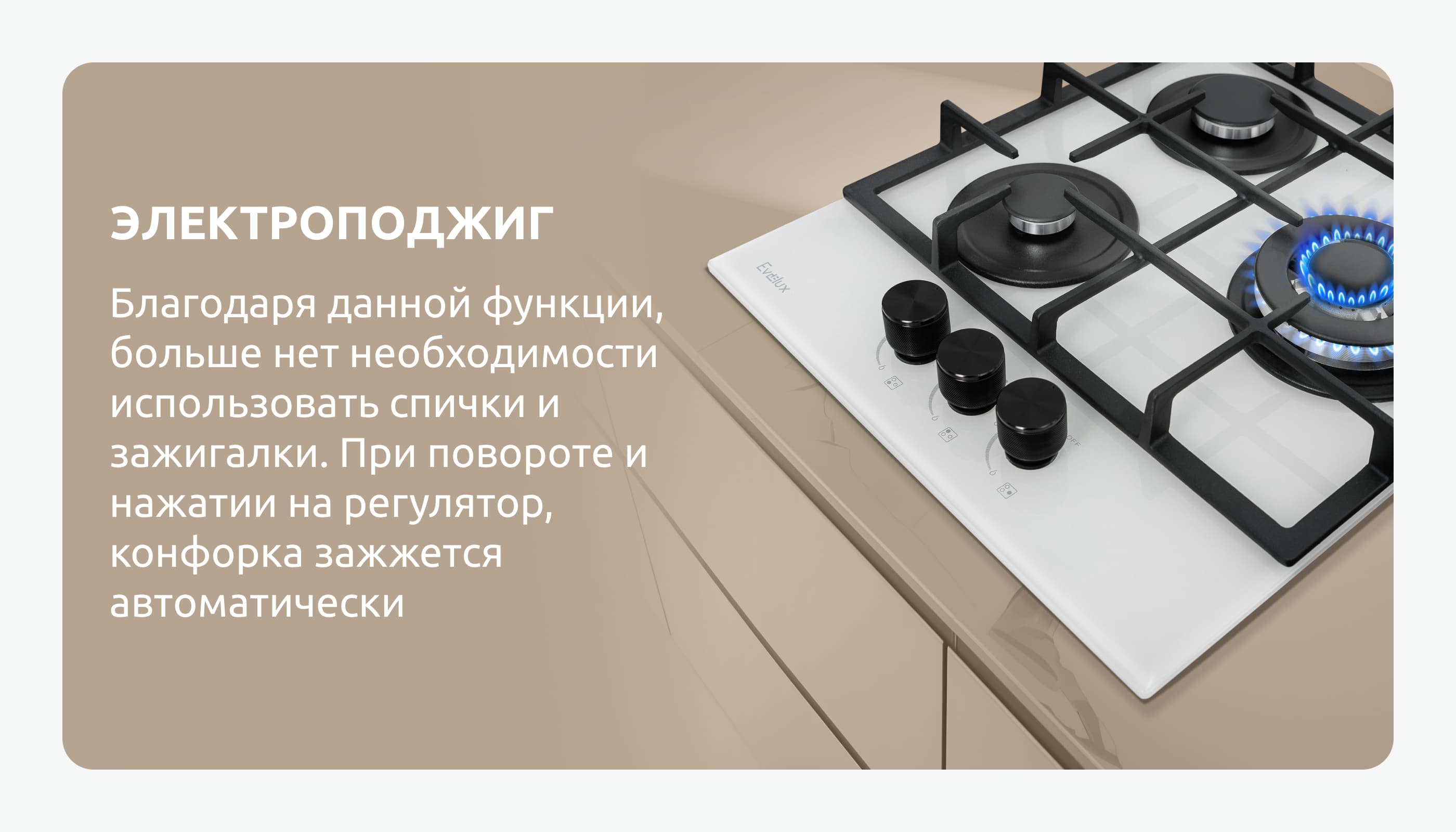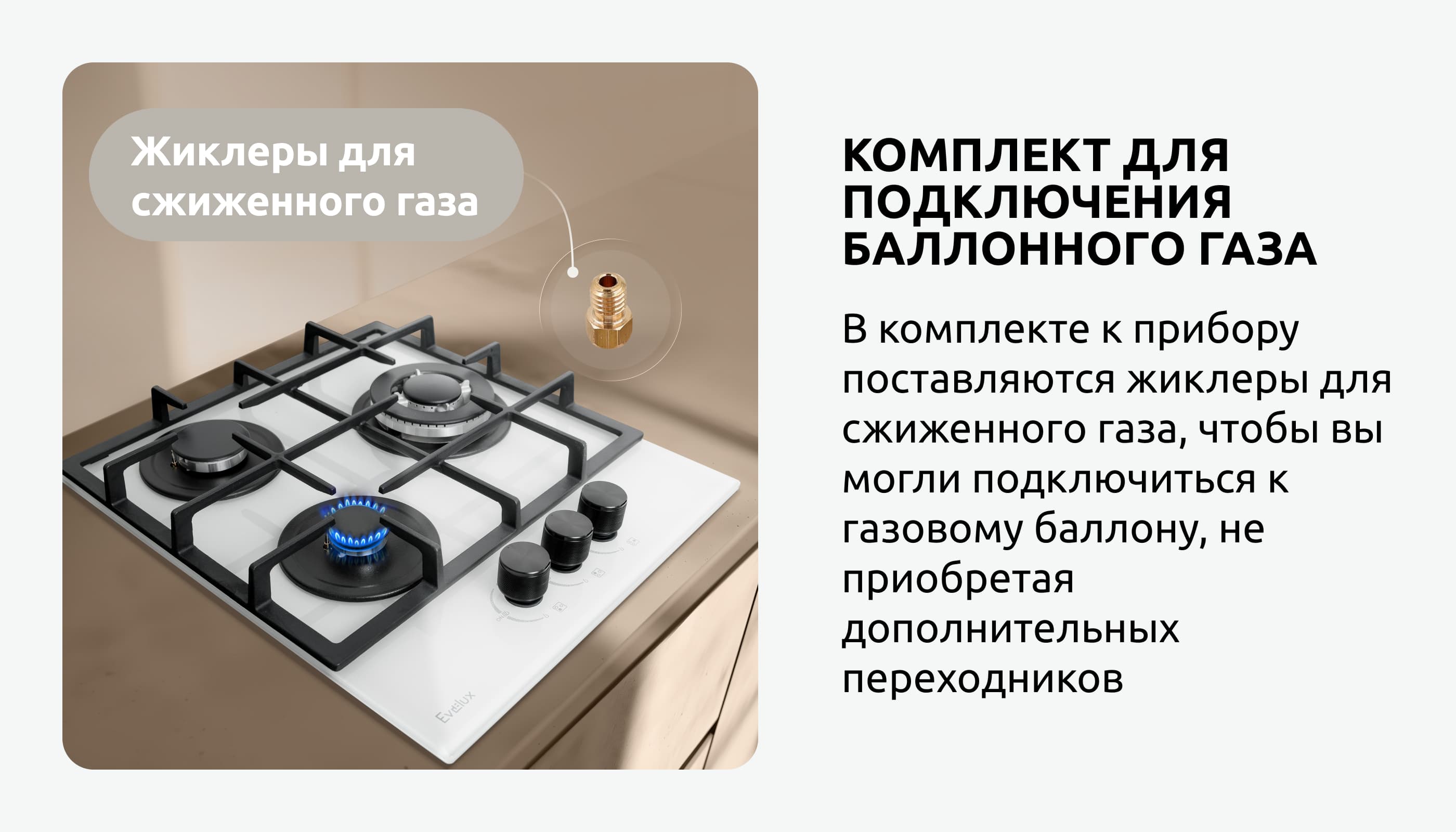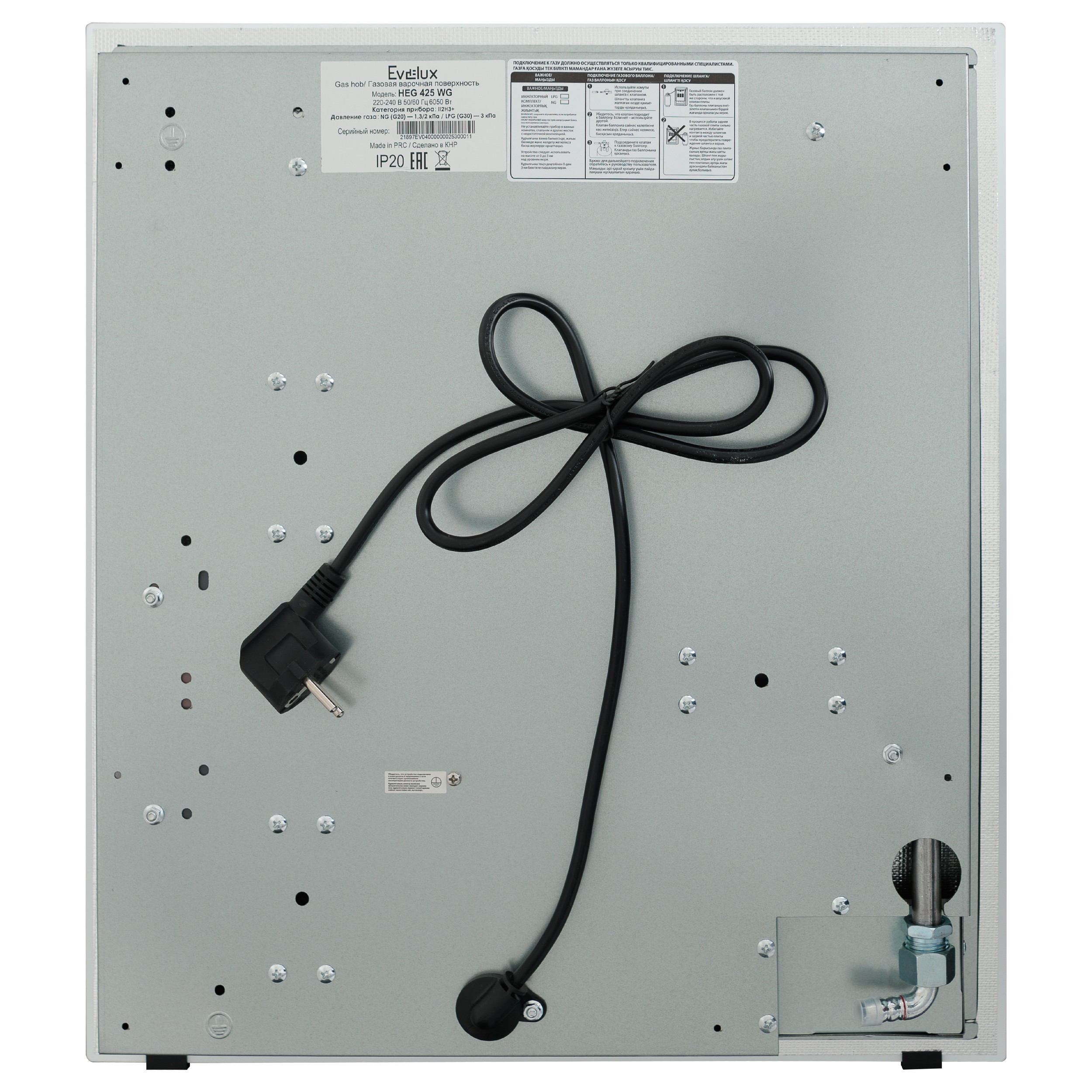 Внимание: подключение газа к прибору должно производиться квалифицированным специалистом. При отсутствии документа, свидетельствующего о подключении прибора к газу специалистом, ответственность за возможные неисправности в работе варочной поверхности компания Evelux не несет. Гарантия распространяться не будет.