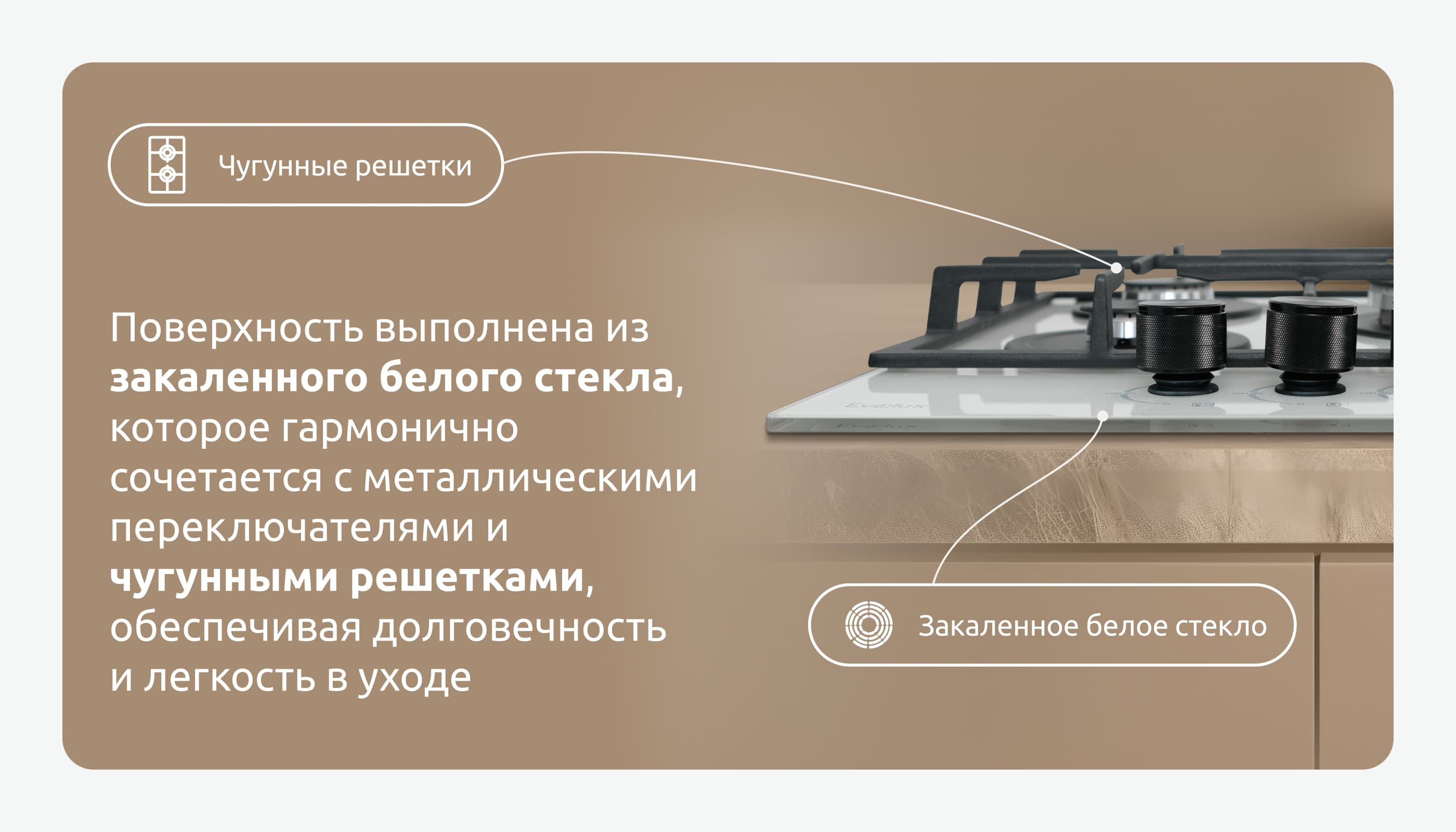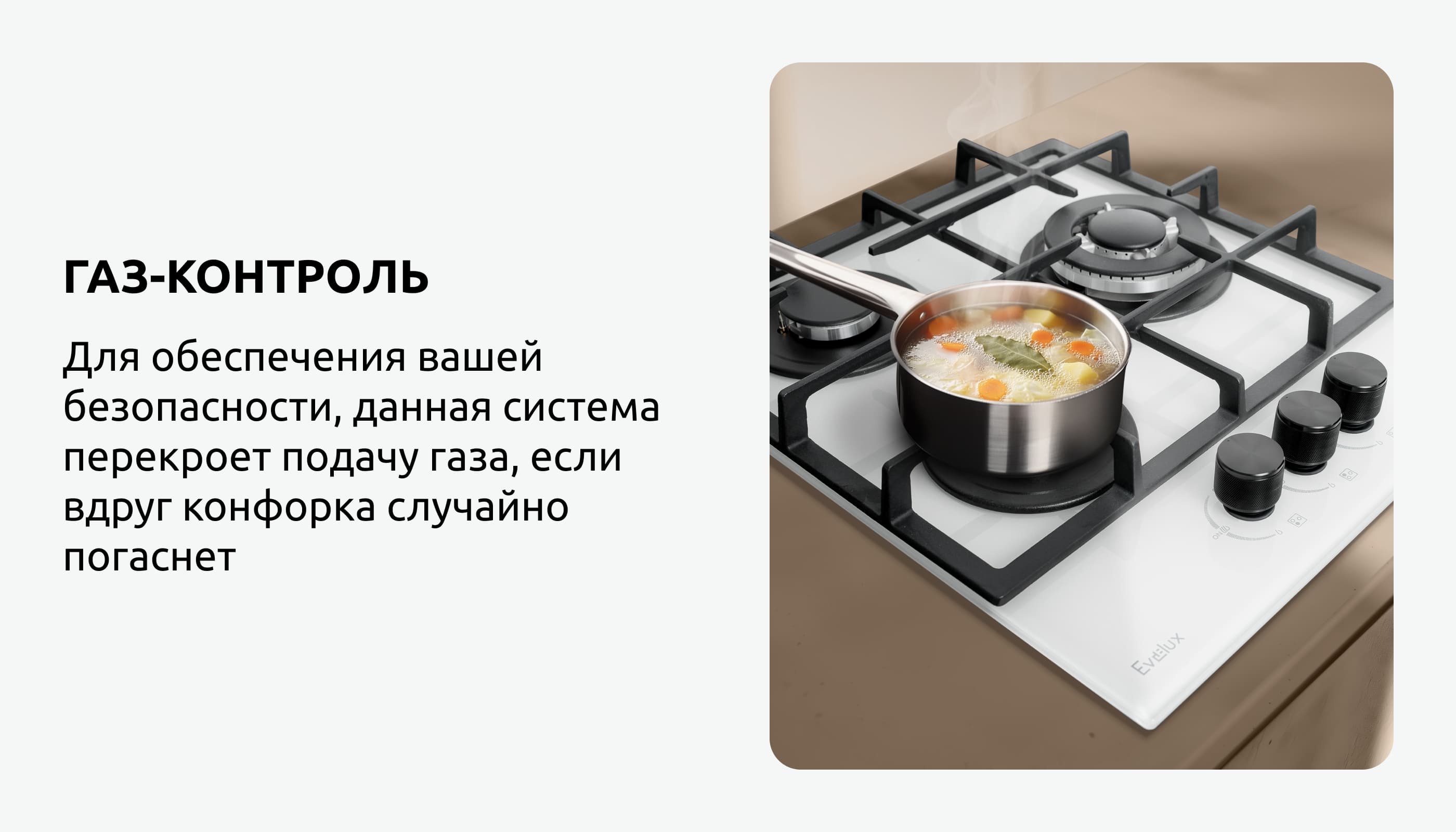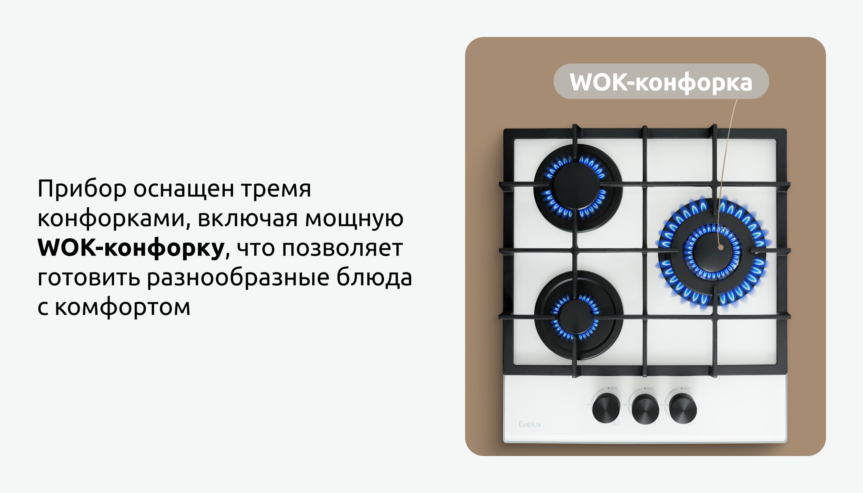 Внимание: подключение газа к прибору должно производиться квалифицированным специалистом. При отсутствии документа, свидетельствующего о подключении прибора к газу специалистом, ответственность за возможные неисправности в работе варочной поверхности компания Evelux не несет. Гарантия распространяться не будет.
