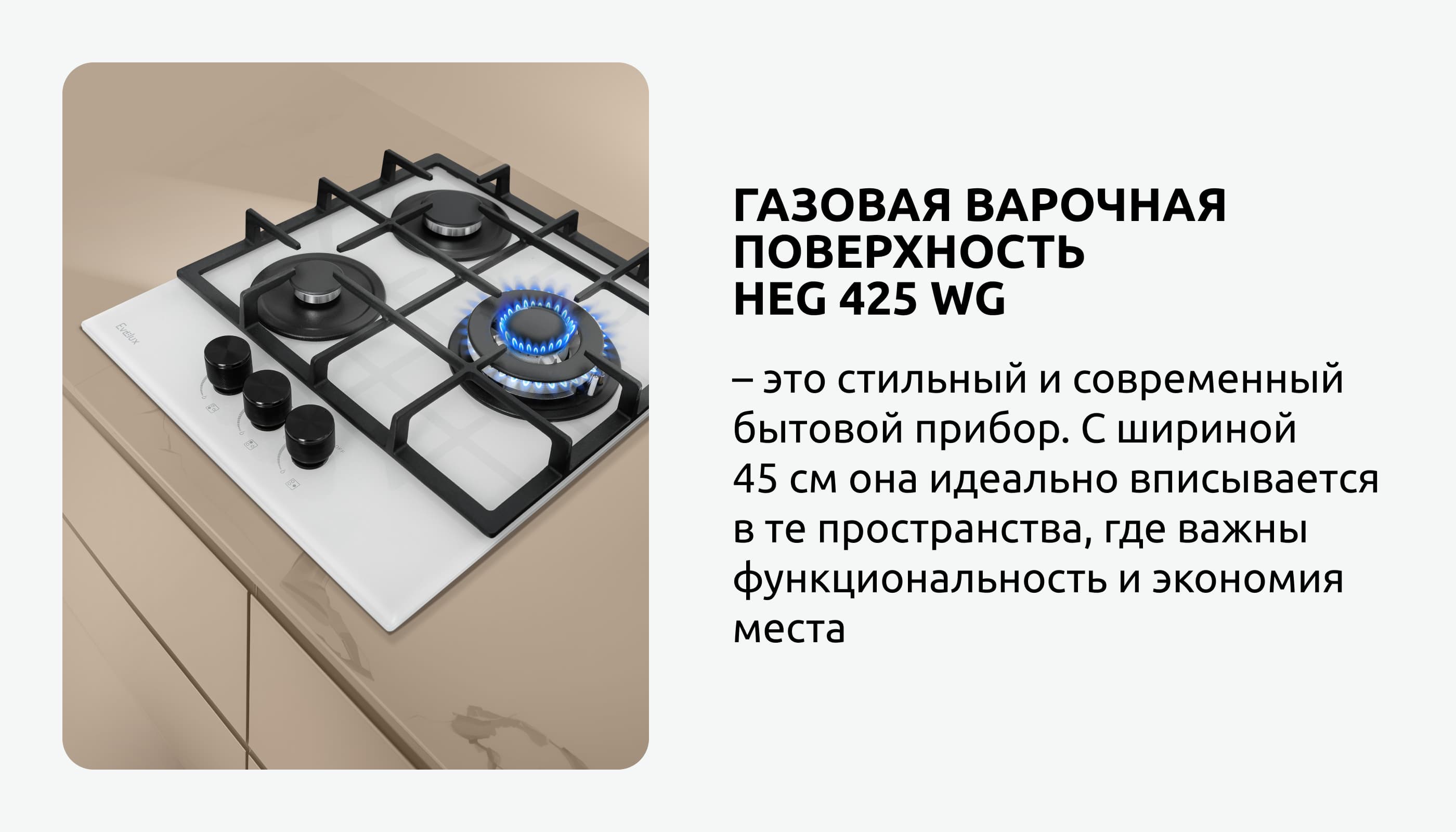 Газовая стеклянная варочная панель HEG 425 WG — стильное решение для современной кухни. Эта встраиваемая техника шириной 45 см выполнена из прочного закаленного стекла белого цвета и оснащена чугунными решетками, которые обеспечивают отличную устойчивость и эргономичность, а также придают панели уникальный стиль благодаря гармоничному сочетанию материалов. Прибор имеет три конфорки, включая мощную конфорку WOK, идеально подходящую для приготовления объемных блюд. Система газ-контроля гарантирует безопасность, автоматически прекращая подачу газа в случае потухания пламени. Удобный электроподжиг позволяет легко запускать конфорки простым поворотом металлических регуляторов, что делает использование панели комфортным и безопасным. Варочная панель HEG 425 WG станет отличным дополнением к любой кухне, сочетая в себе функциональность, безопасность и современный дизайн.
