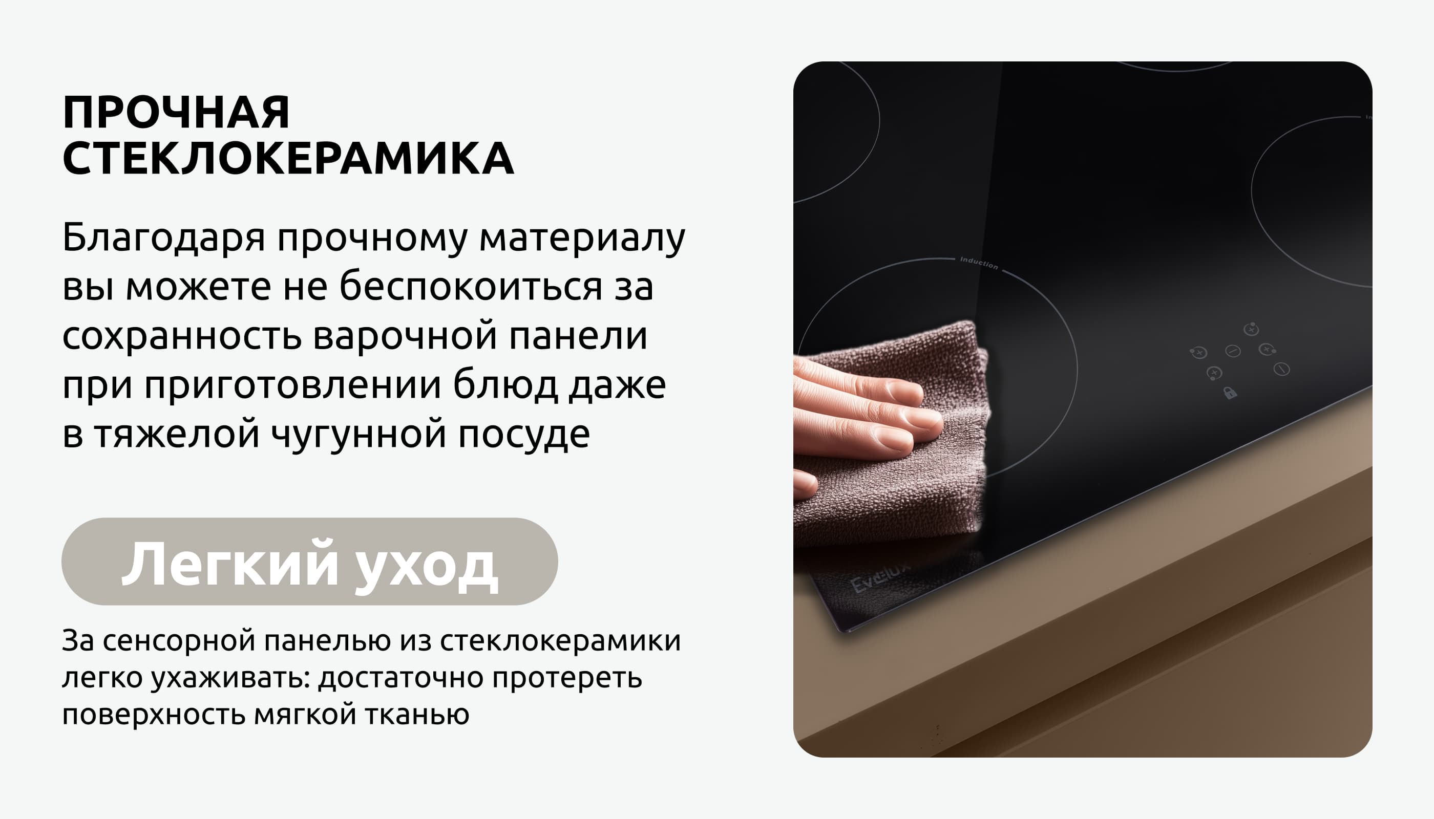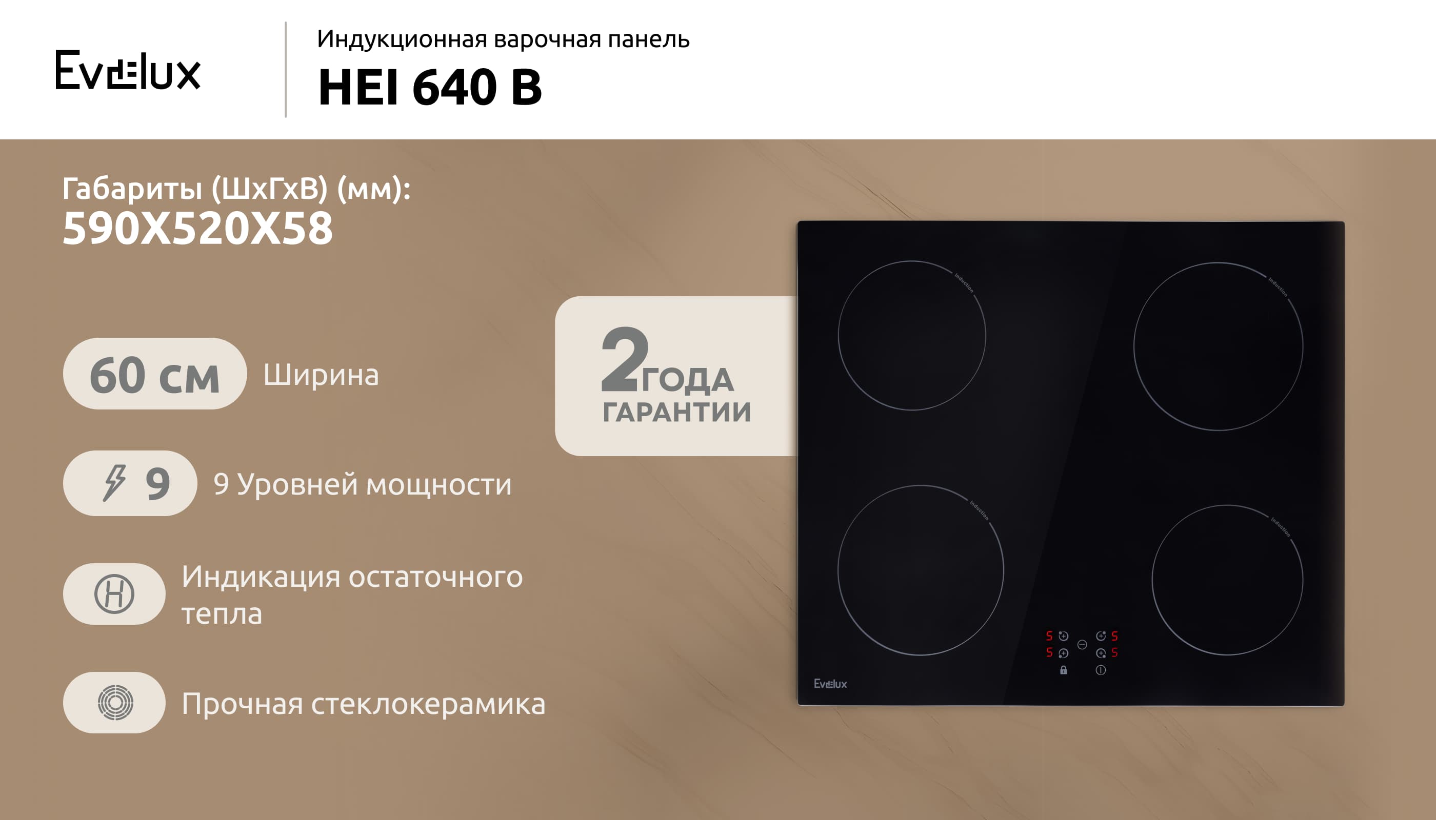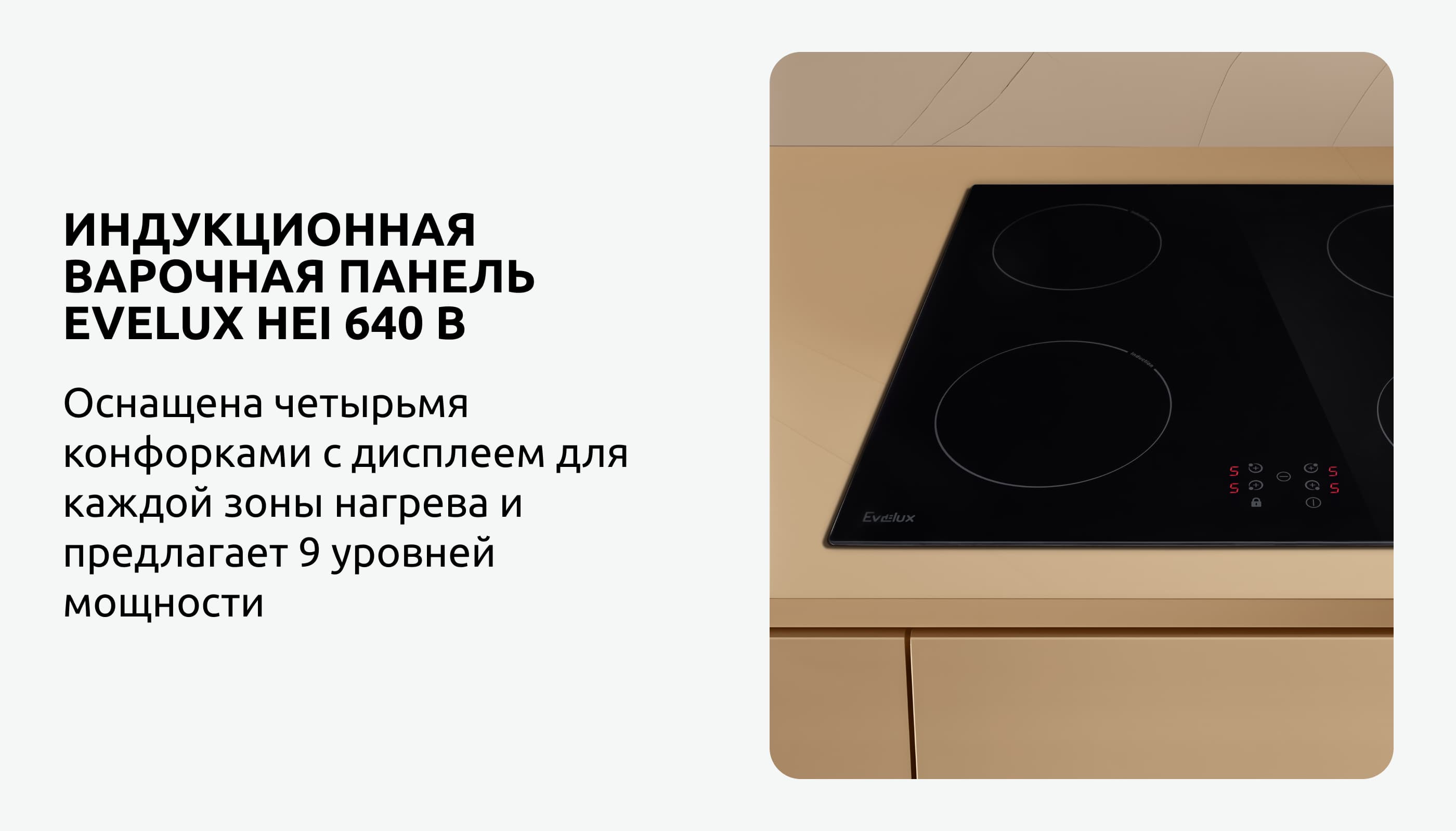 Индукционная варочная панель Evelux HEI 640 B, стандартной ширины 60 см, представляет собой современное встраиваемое решение для кухни. Изготовленная из прочной стеклокерамики и предлагая 9 уровней мощности, она оснащена четырьмя конфорками с дисплеем для каждой зоны нагрева. Удобное сенсорное управление позволяет точно регулировать температуру приготовления в зависимости от типа блюда. Индукция, известная своей высокой эффективностью, нагревает только дно специальной посуды и обеспечивает быстрое приготовление пищи. Поверхность варочной панели быстро остывает до безопасной температуры, что помогает избежать случайных ожогов и облегчает уборку. Индикация остаточного тепла информирует пользователя о том, достигла ли поверхность безопасной температуры. Функция блокировки от детей обеспечивает дополнительную безопасность, исключая случайное вмешательство в работу прибора маленьких членов семьи. Кроме того, варочную панель HEI 640 B можно легко комбинировать с другой встраиваемой техникой Evelux, например, с аналогичными по ширине духовыми шкафами, что делает её идеальным выбором для создания гармоничного кухонного пространства.