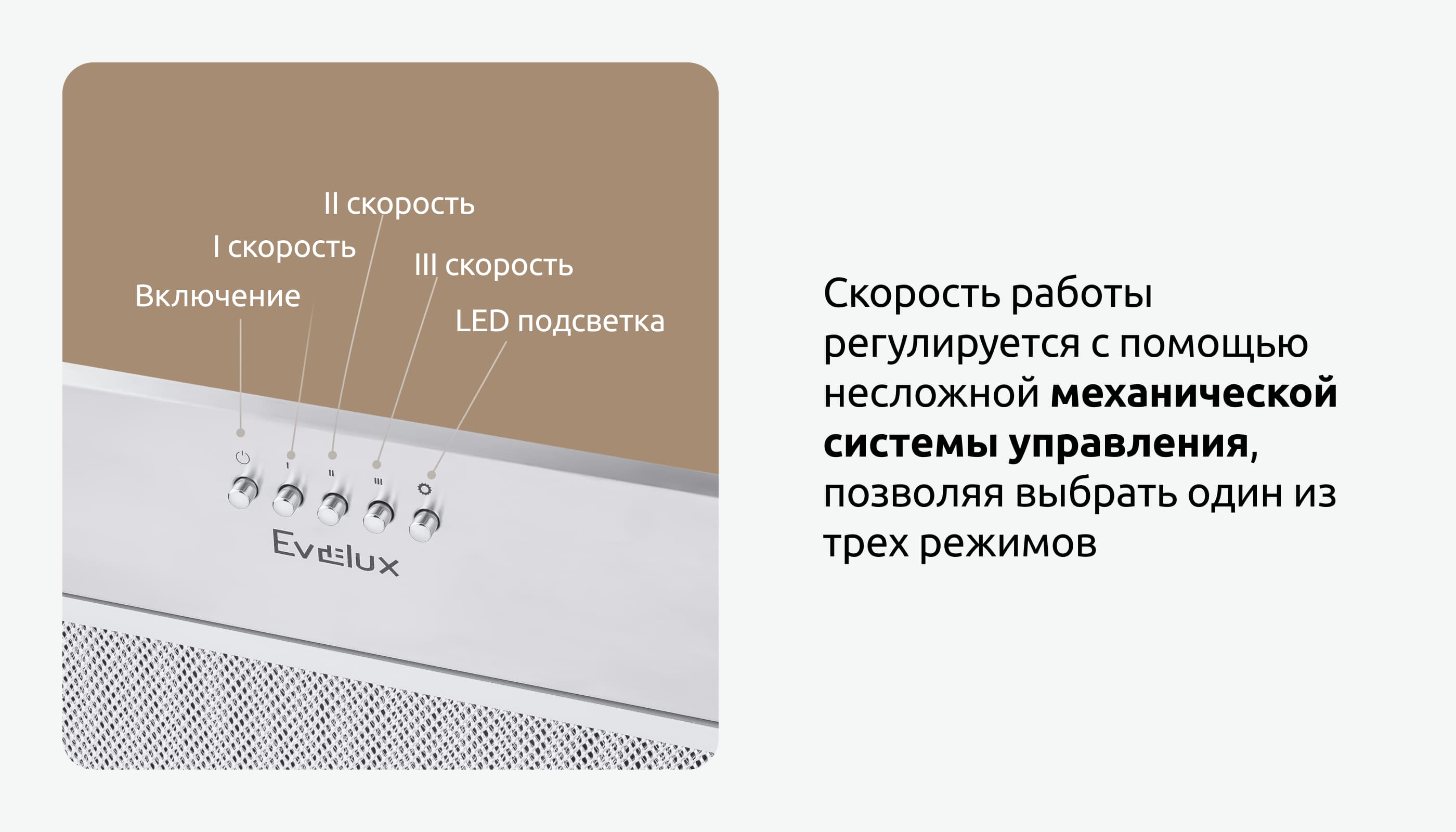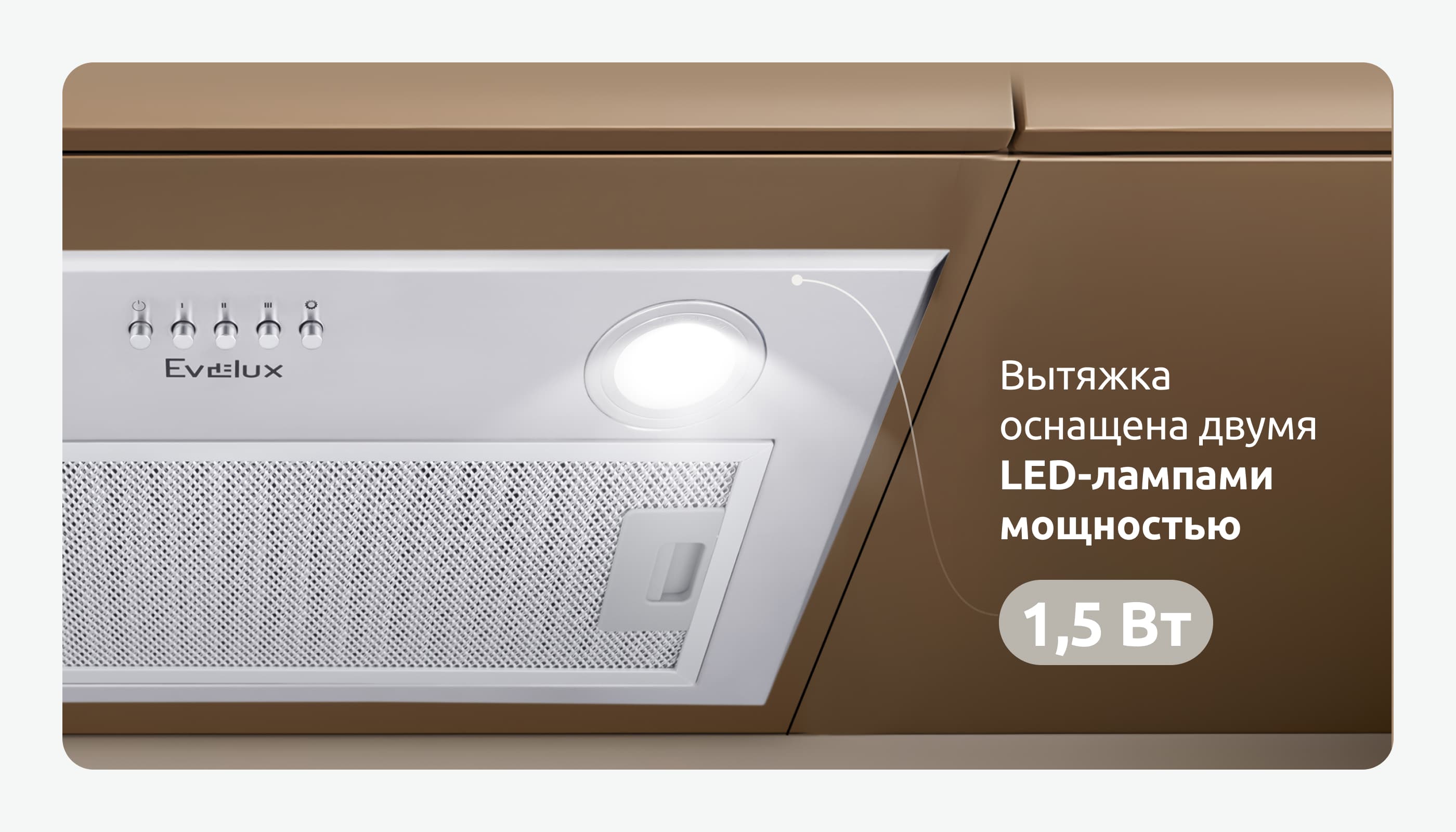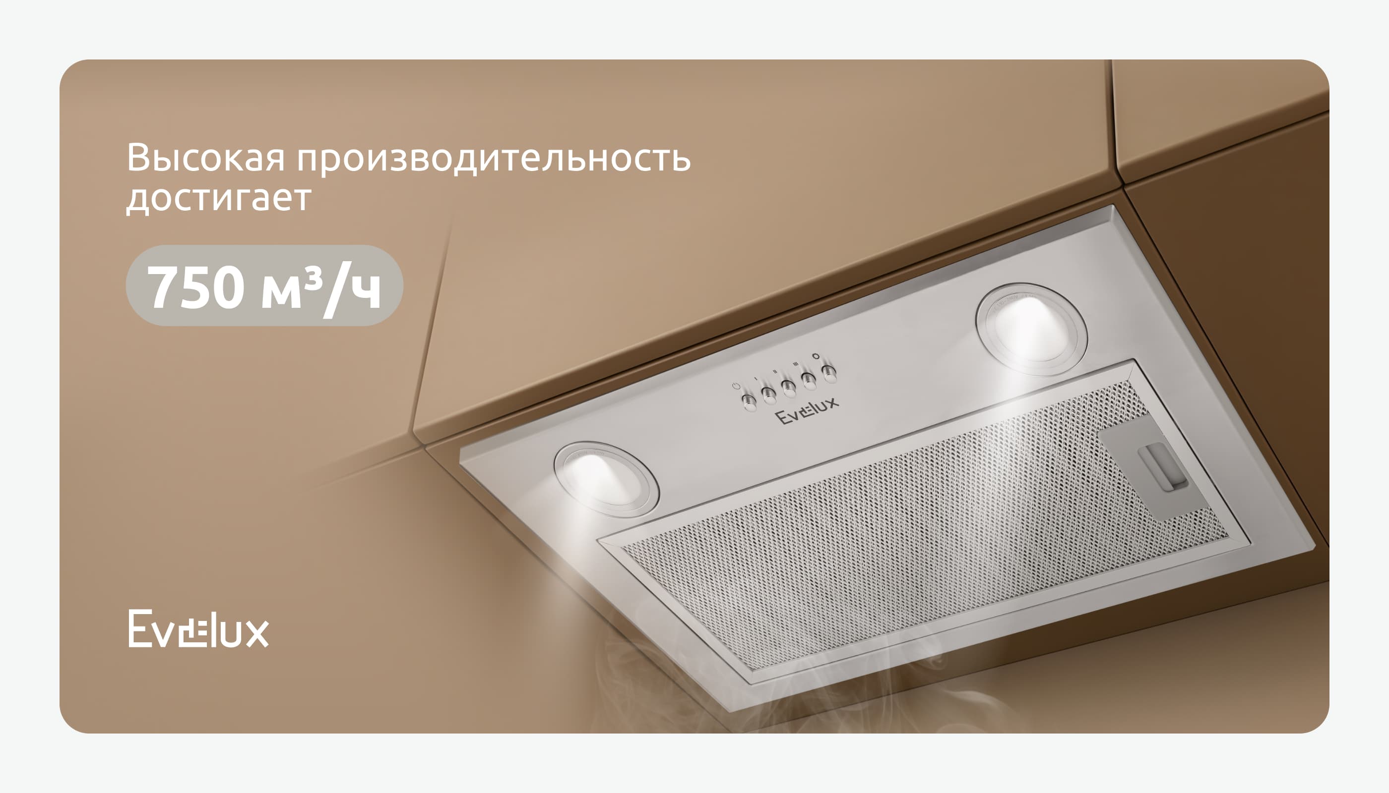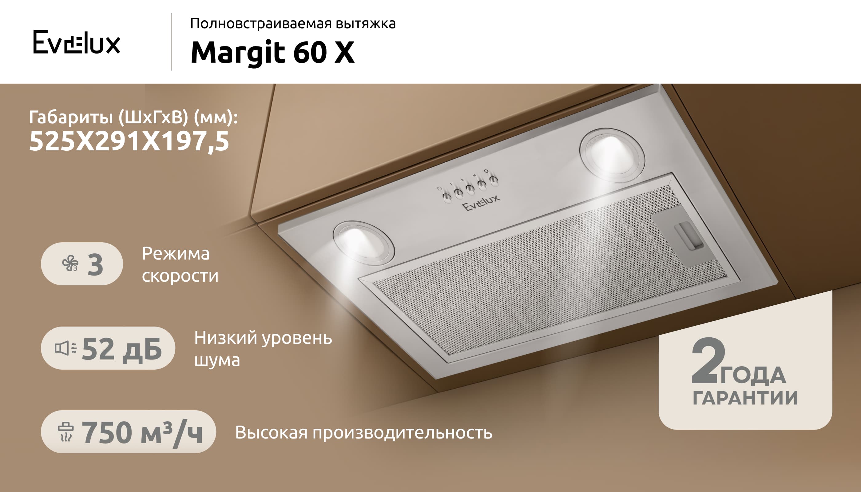 Современная полновстраиваемая вытяжка Evelux Margit 60 X эффективно избавляет кухонное пространство от дыма и неприятных запахов, создавая при этом гармоничный ансамбль с любым интерьером. В приборе предусмотрены 3 режима работы, легко регулируемые благодаря простой механической системе управления. Производительность составляет 750 кубометров в час, при этом максимальный уровень шума прибора не превышает 52 дБ. В корпусе вытяжки установлены 2 LED-лампы мощностью 1,5 ватта, которые отличаются экономичным потреблением энергии и создают мягкое, комфортное освещение.