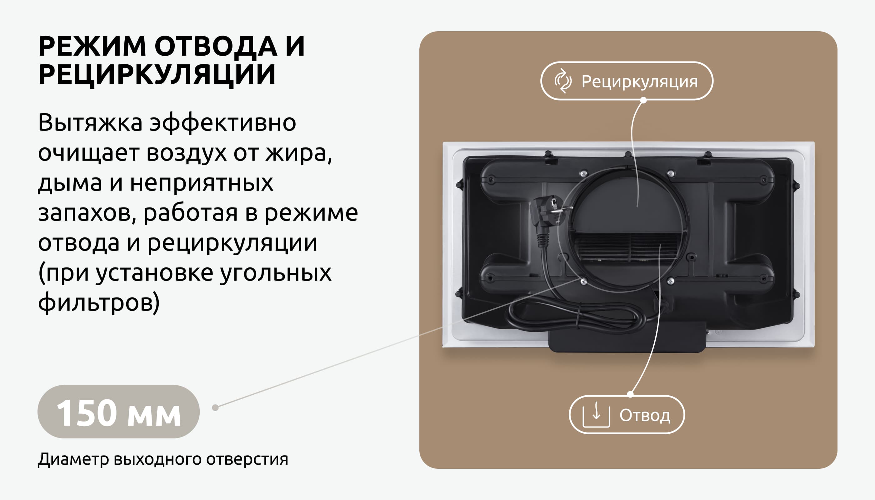 Вытяжка устанавливается внутри навесного кухонного шкафчика, где предварительно выпиливается отверстие согласно габаритам, указанным в инструкции. Рекомендуемая высота установки 65-75 см от рабочей поверхности до нижней точки прибора. Желательно использовать минимум соединительных элементов для воздуховода и соблюдать диаметр вентиляционных труб не менее, чем диаметр выходного отверстия. В режиме рециркуляции необходимо устанавливать угольный фильтр.